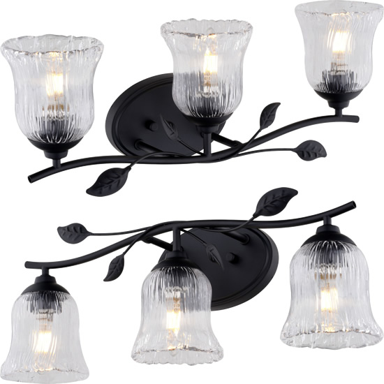 Bring the tranquility of nature to your bathroom with the Fairwood vanity wall light fixture. Key features include three lights for ample and balanced illumination and clear ribbed glass shades that add texture and beautifully diffuse the light while evoking natural forms. Each unique, branch-like shape is tipped with a delicate leaf that brings a touch of the outdoors in. The matte black finish complements the natural inspiration, adding a touch of modern sophistication. Transform your bathroom into a tranquil escape.