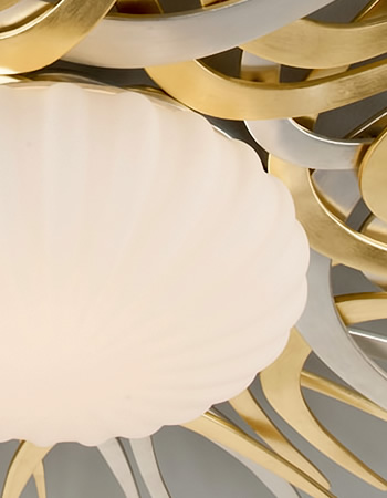 Corbett Lighting brings rich hand-applied gold and silver leaf to the distinctive Helios flush lights. Installed on the ceiling these large pieces make a statement. On the wall, they can be appreciated from every angle.