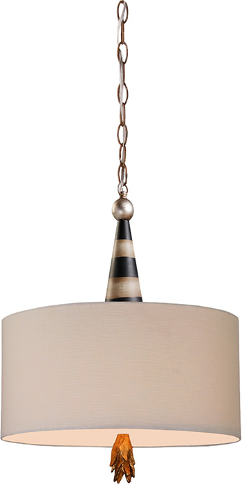 The Flambeau collection is one of our signature designs that works in many spaces to create conversation as well as art. The drum shaped shade is 18" in diameter and it includes 2 Medium based lights that will bring the perfect amount of light to the lucky space. The black and cream stripes makes a simple drum pendant exciting, and the flame finial is the perfect finishing piece.