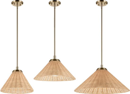 The Arcadia Collection has a metal frame made to look like bamboo in Burnished Brass finish. A band of natural rattan diffuses the bulbs.