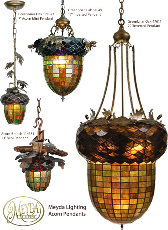 As impressive as a mighty Oak Tree, these art glass acorn pendants from Meyda Lighting feature an art glass crown sprouting oak leaves.
