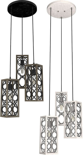Single pendant and multi light swag chandeliers with 3 or 4 lanterns swagged from a single canopy. Installs into any ceiling junction box; includes swag hooks and mounting hardware. Sloped ceiling adaptable.