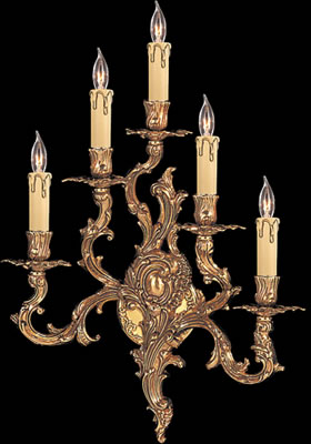 These organic sconce is a part of the Olde World Collection. They feature winding branches with bright white candle sleeves. The bobeches, arms and wall bracket are cast in high relief of branches and leaves. They coordinates with a Traditional, Art Nouvea or French Country Style interior. Available with three or five arms.