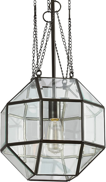 The masterfully crafted Lazlo Pendant Collection by Sea Gull Lighting features faceted orb pendants fashioned of twenty-four Clear or Mercury glass panels secured within an octagonal frame finished in Heirloom Bronze. The pendants hang dramatically suspended from uniquely cross hatched chains. The pendants are open at the top and bottom. The Lazlo Pendant Collection includes one-light pendants and four-light pendants in small, medium and large. The one-light designs easily convert to LED by purchasing LED replacement lamps, sold separately.