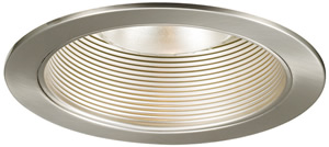 Crafted of one-piece spun aluminum or durable stamped metal, the 6-inch Line Voltage Recessed Downlights are available with full reflector trims that ensure proper lamp position, low glare and superior performance photometric. A variety of styles available for sloped ceilings. Recessed trim with interior step baffle. For use with R-600 series Line